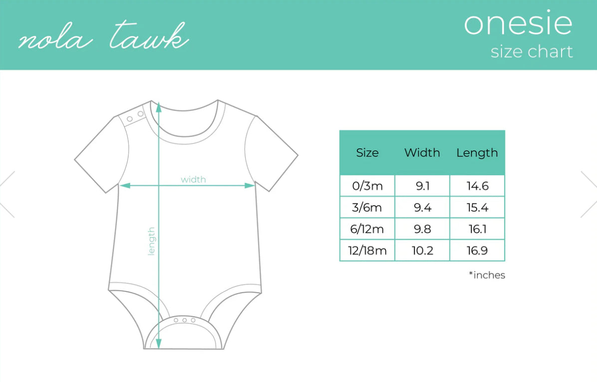 All Nola Tawk organic baby onesies are made with:- 100% GOTS certified organic cotton- Snug fit- Snaps on shoulder and bottom to make changes quick and easy