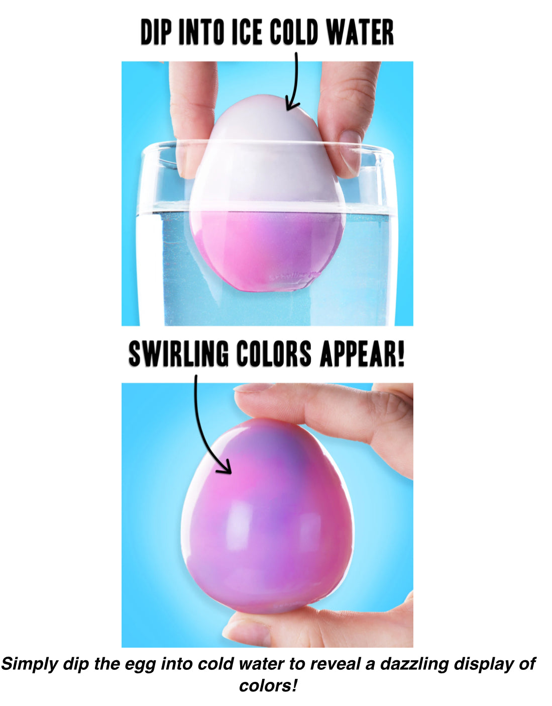 To see this stress ball's magic, all you'll need is a cup of ice-cold water. Submerge part or all of the egg, and watch as its off-white exterior transforms into a swirl of vibrant hues! Once “painted”, your stress ball will wear its new colors until outside heat slowly turns it back to its original shade, after which you’re free to watch the transformation again and again.