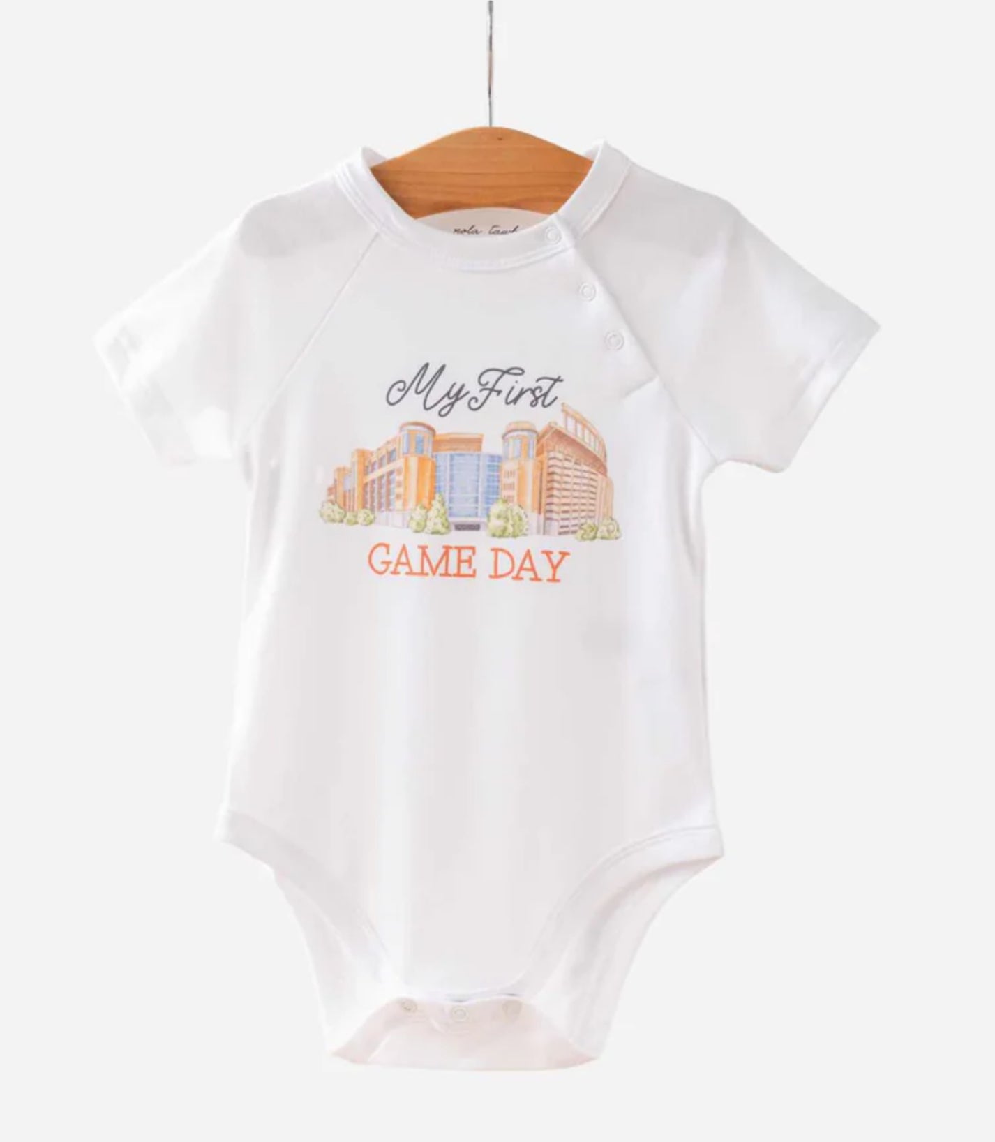 Hook ’Em in our “My First Game Day” Organic Cotton Baby Onesie! Featuring a sweet illustration of Darrell K Royal–Texas Memorial Stadium, this cozy piece celebrates your little one’s very first Longhorns debut. Whether they’re tailgating in Austin, cheering on a touchdown, or throwing up their first Hook ’Em Horns, this spirited onesie wraps them in comfort while showing off burnt orange pride. From the opening kickoff to the final victory cheer, it’s a game day essential for the tiniest Texas fans.